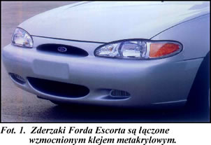 W 1986 roku Ford wprowadził nowy model serii Taurus / Sable. Ta seria przeszła do historii jako najlepiej sprzedające się samochody. W projekcie zderzaka tego modelu zastosowano całkowicie nowe rozwiązanie. Cały zderzak został wykonany z fasady i belki wzmacniającej wykonanych z termoplastów, sklejonych wzmacnianym klejem metakrylowym (fot. 1 i rys. 2). Określenie wymagań trwałościowych i parametrów procesu uczyniło wiele dla zdefiniowania doboru substratów i kleju. Oczywiście, zderzak musiał spełniać wymogi odporności udarowej w niskich temperaturach porównywalne z jego metalowymi odpowiednikami. Dodatkowe wymagania stawiało wieloletnie doświadczenie Forda w określaniu wymogów trwałości zderzaków, swoje dodały też normy wyznaczane przez Federalne Standardy Bezpieczeństwa Pojazdów Motorowych (FMVSS) nr 215 dla zderzaków.