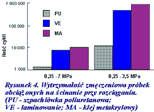 Rysunek 4 pokazuje porównanie cyklicznych testów zmęczeniowych porównujących zarówno stosowany w marynistyce klej / uszczelniacz poliuretanowy i znany klej metakrylowy. Testy zostały przeprowadzone w dwu różnych warunkach obciążeń. Widać jasno, że poliuretan nie jest odpowiedni do tego zadania. Sprawdza się lepiej jako uszczelniacz, niż jako klej konstrukcyjny.